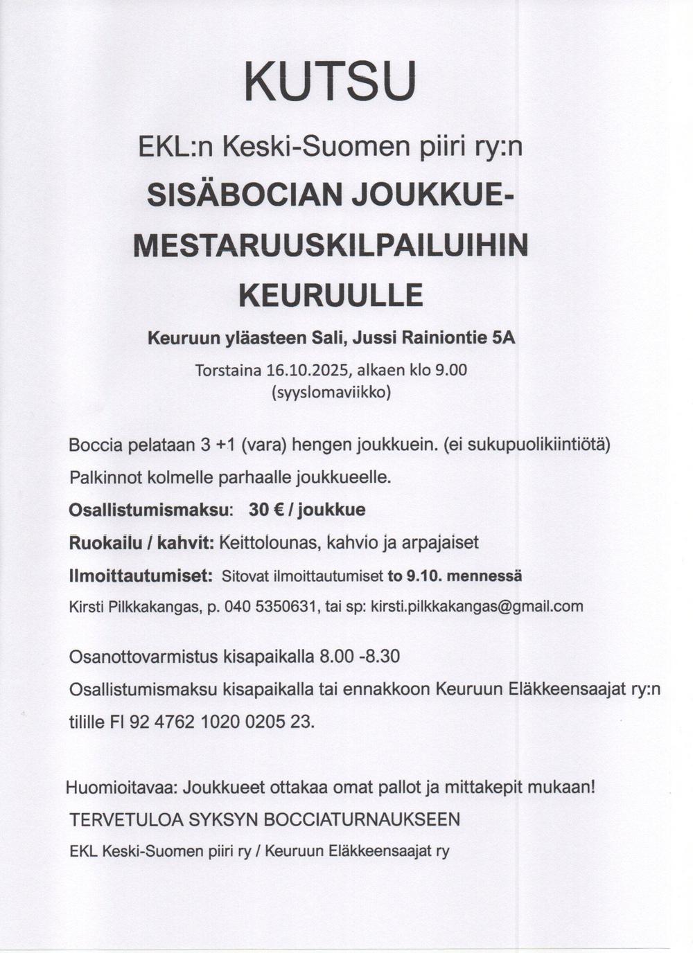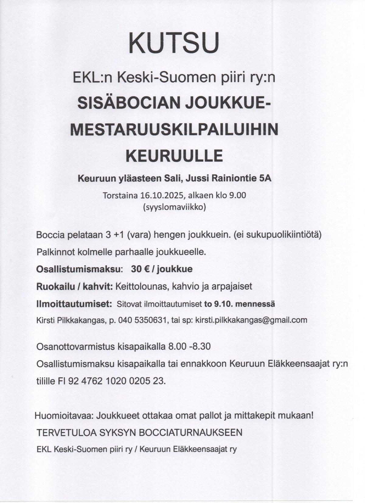 KUTSU EKL:n Keski-Suomen piiri ry:n SISÄBOCIAN JOUKKUE- MESTARUUSKILPAILUIHIN KEURUULLE