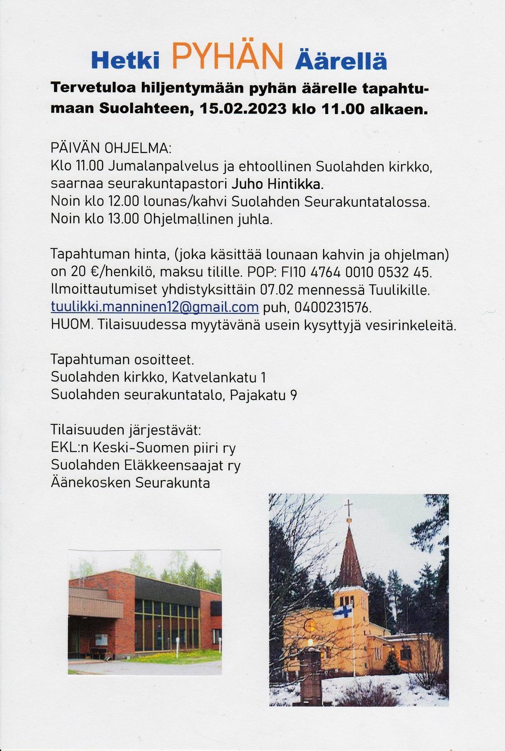 Tervetuloa hiljentymään pyhän äärellä tapahtumaan Suolahteen. Kutsu ohjelmatitoineen ja toimintaohjeineen löytyy oheisena.