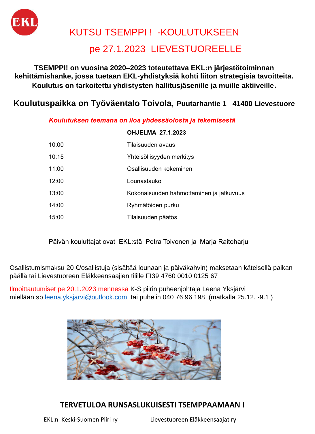Piirin ensimmäinen vuoden 2023 tapahtuma on Tsemppi! koulutus Lievestuoreella pe 27.01, jonne toivomme yhdistyksistä runsaasti osallistujia. Tsemppi! on vuosina 2020-2023 toteutettava järjestötoiminnan kehittämishanke, jossa tuetaan EKL-yhdistyksiä kohti liiton strategisia tavoitteita.